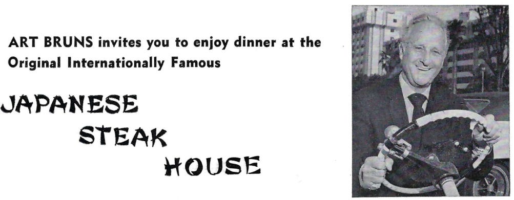 The Japanese Steak House did not begin in Arlington, however, but in perhaps the unlikeliest of places - Miami. In 1962, German-American (and Floridian) Arthur Gerhard Bruns, owner of the Miami Springs Villas, opened his first The Japanese Steak House, a teppanyaki-style steakhouse.34 Bruns was inspired after a visit to Japan and brought the idea of “steaks…prepared on a huge stone before your eyes” back to the States. According to the April 1963 issue of the Journal of the American Institute of Architects, Bruns’ Miami restaurant was one of only three in the world where steaks were prepared that way.5