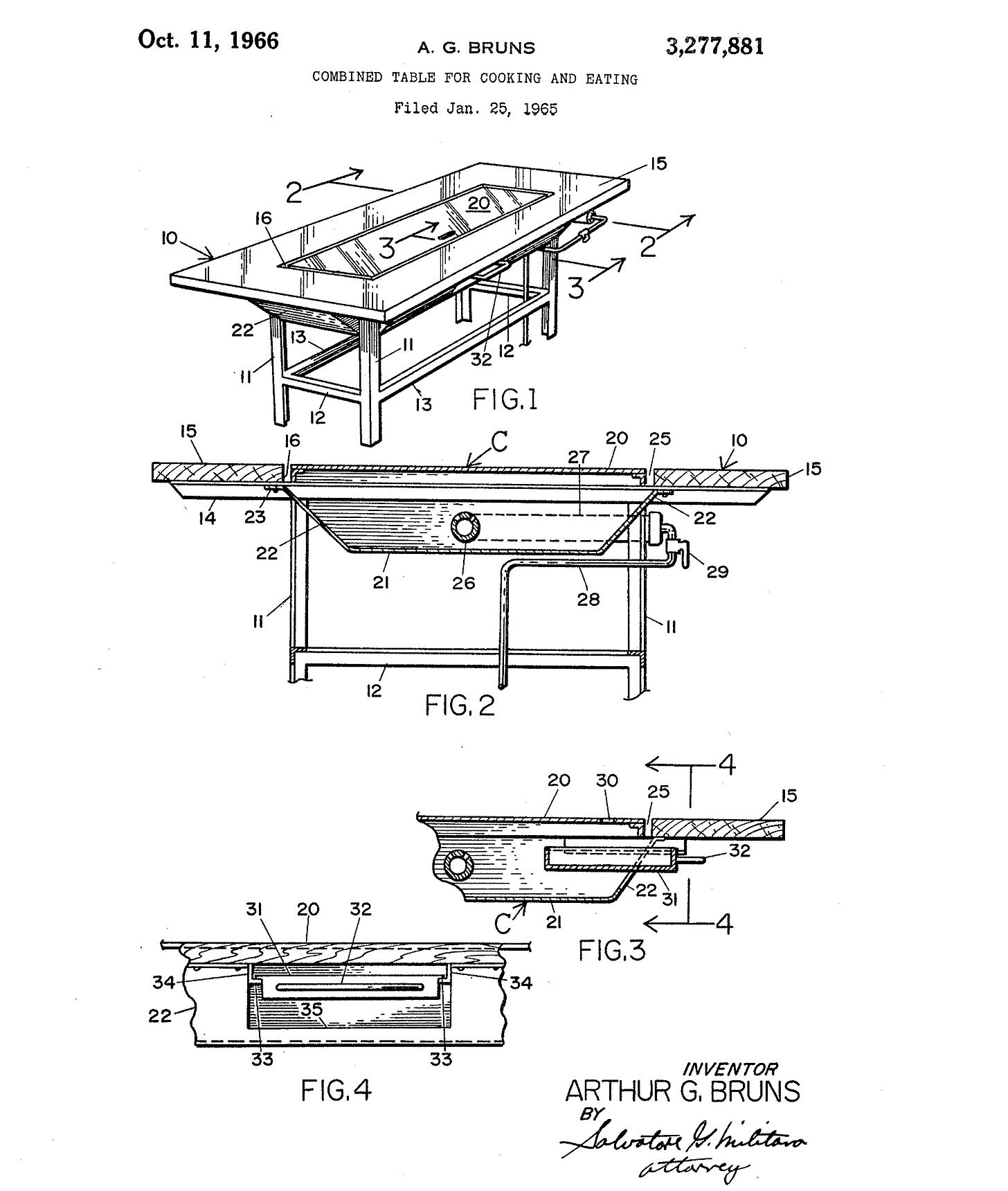 In addition to being a restaurateur and property developer, Bruns also dabbled in inventing. In 1965, he filed a patent application for a “combined table for cooking and eating…without subjecting the persons that are eating at the table to the intense heat being utilized for cooking purposes.” Bruns envisioned a table whose central portion would be dedicated to cooking with people (i.e., diners) seated about the outer portion. It is unclear how his invention differed, if at all, from a Japanese teppan.